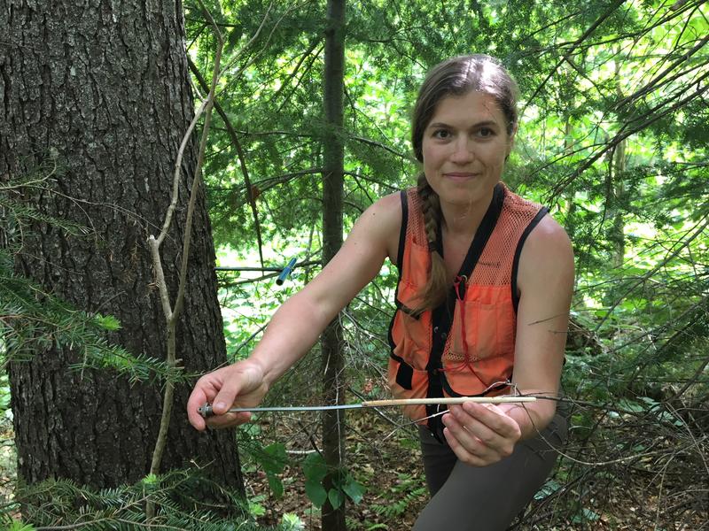 Scientist Alexandra Kosiba shows a core sample from a red spruce that shows strong growth over the last decade. Photo by John Dillon for VPR