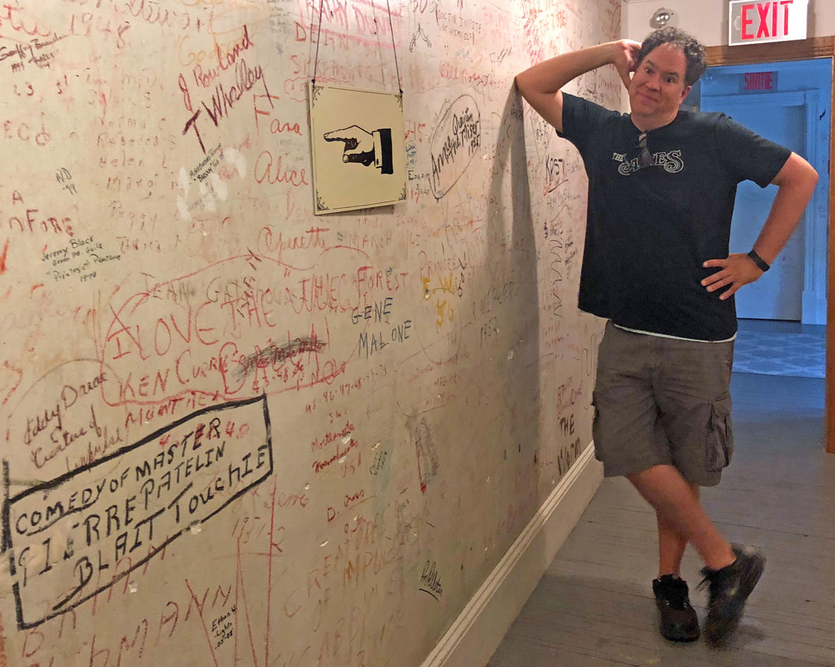Chris Planetta, President of the Borderline Players’ board of directors, stands in a hallway between backstage and the dressing rooms where actors from productions past have signed the walls. This area, the stage and the front rows of seats are in Canada. Other audience seating, including the balcony, is in the United States. Photo by Amy Kolb Noyes for VPR