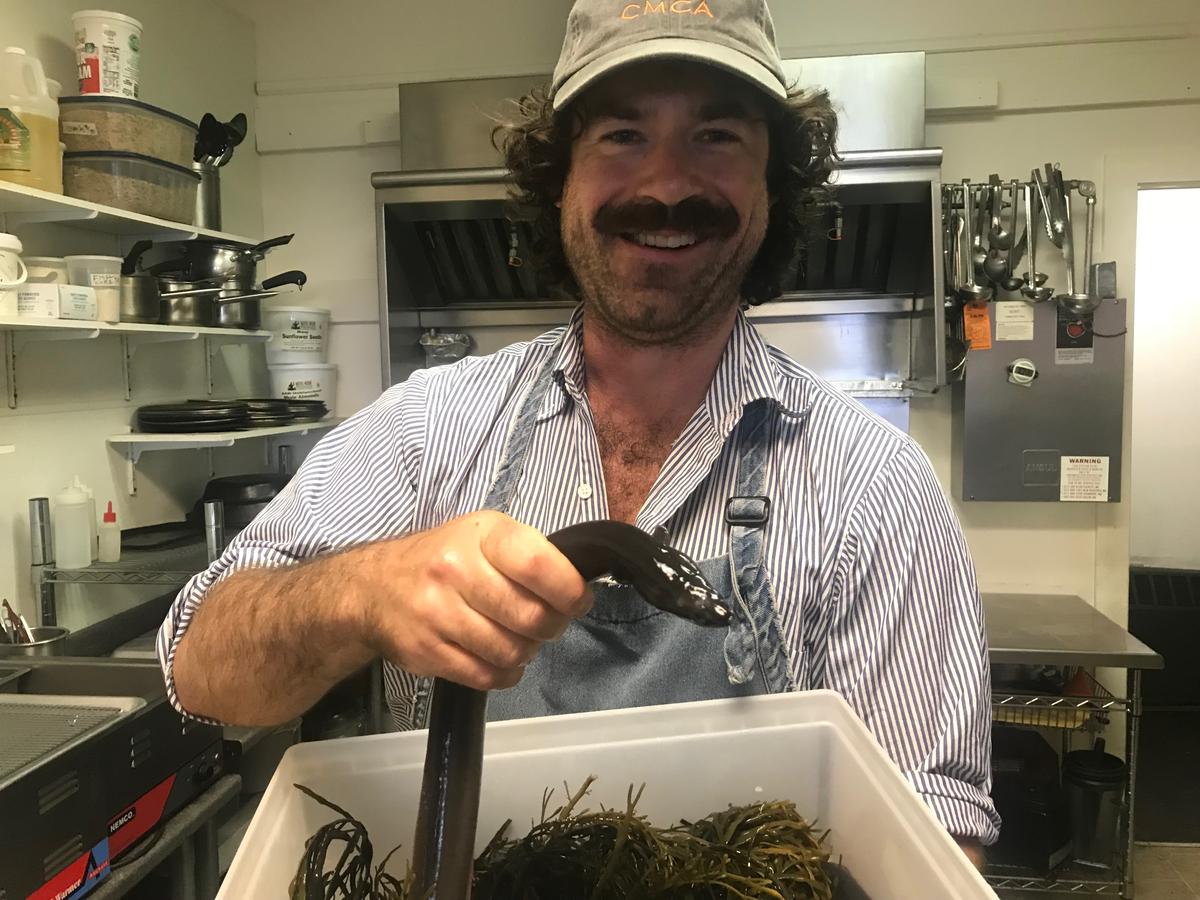Sam Richman, owner-chef of Sammy’s Deluxe restaurant in Rockland, with some full-grown American Unagi. He says his patrons tend to prefer it smoked, European style, rather than as Japanese sushi. Photo by Keith Shortall for Maine Public