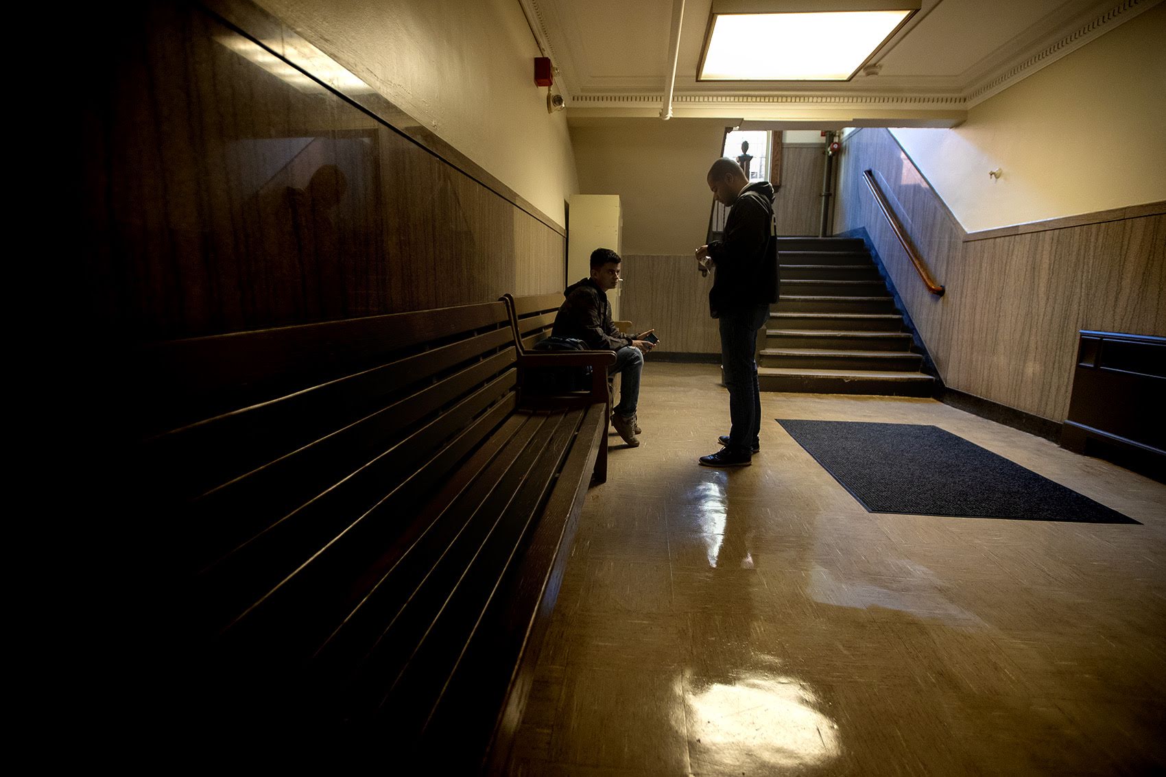 Diego Pizarro, a front line youth worker at Roca, stops to talk with a young man in East Boston District Court. Photo by Jesse Costa for WBUR