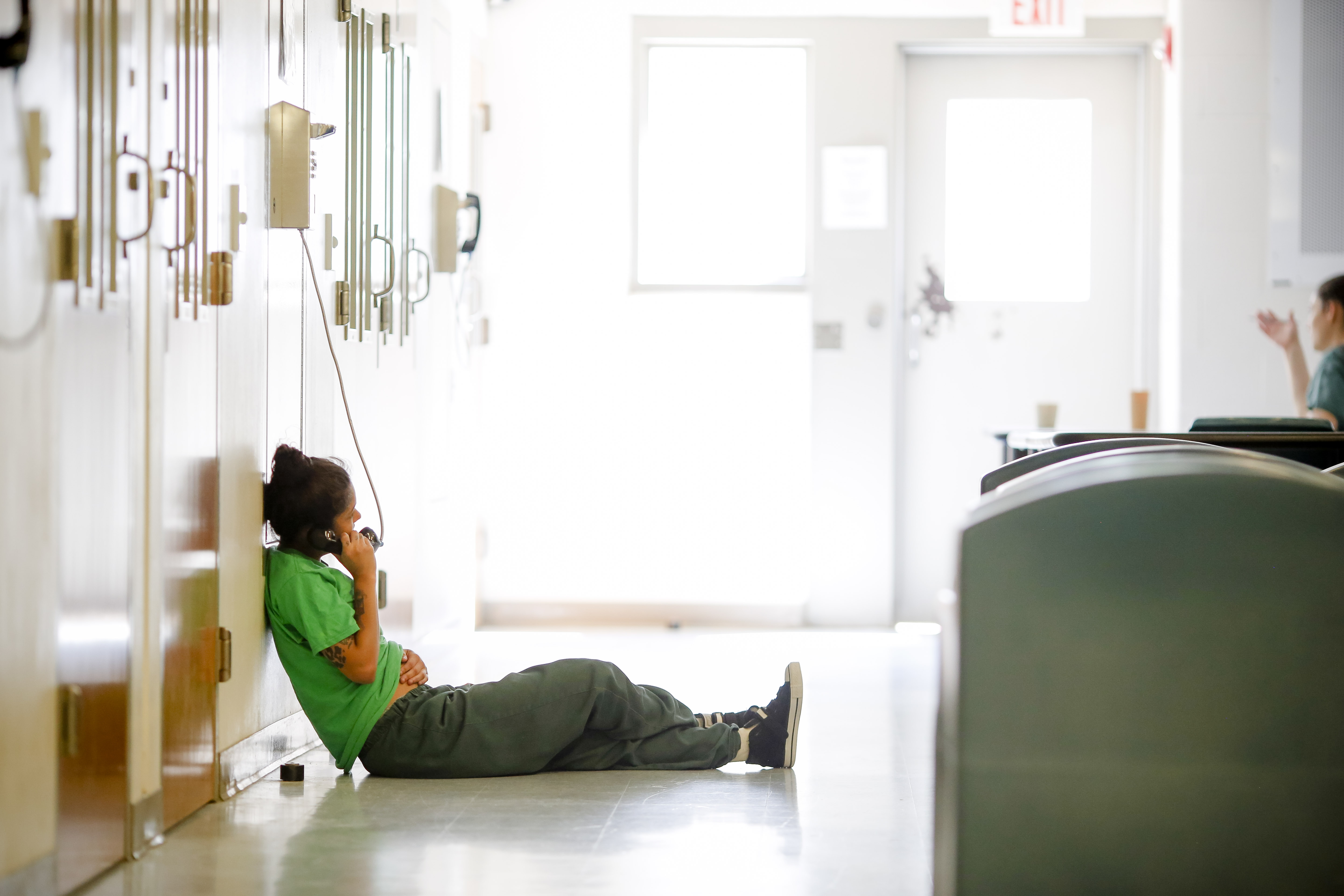 A woman at the Western Massachusetts Regional Women’s Correctional Center speaks on the phone. Photo by Stephanie Zollshan for the Berkshire Eagle