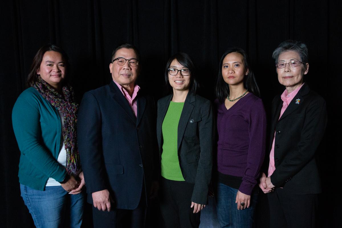 Mui Mui Hin-McCormick (at left) recruited the Asian Ambassadors a few years ago. They are Laotian elder Howard Phengsomphone, Vietnamese refugee Quyen Truong (center), Laotian refugee Sou Thammavong and Japanese immigrant Mari Merwin (at right). Photo by Ryan Caron King for Connecticut Public Radio