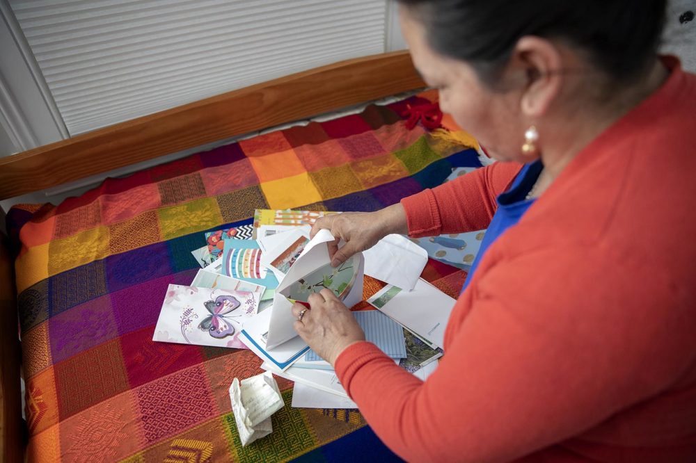 Maria Merida sifts through birthday cards she received last year from members of the church congregation where she’s been living in “sanctuary” for more than a year. Photo by Robin Lubbock for WBUR