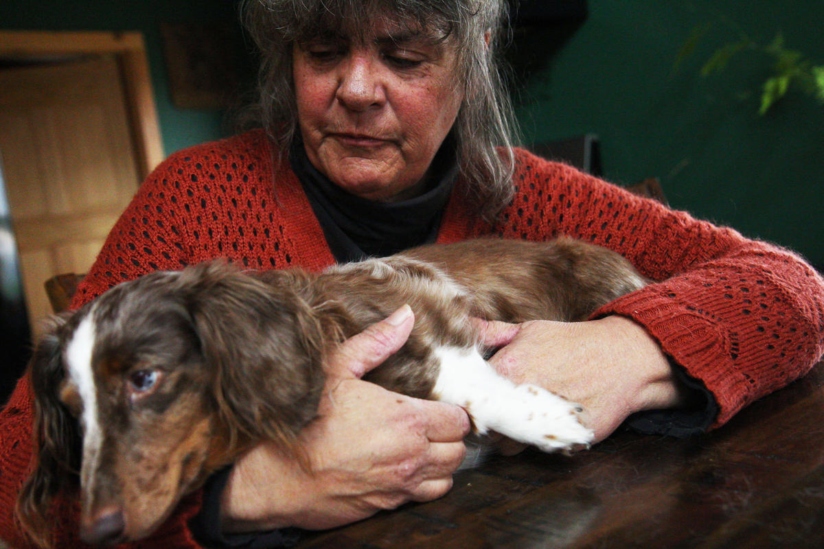 - Peggy Sumner holds onto Lena, who belonged to Peggy’s daughter, Samantha, before she died in a car crash in 2016. Peggy said she often holds and pets Lena when she’s grieving her daughter. (Elodie Reed / Vermont Public Radio)