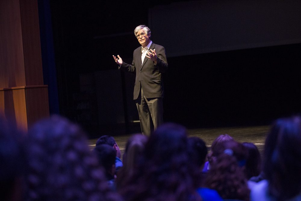 John Broderick, a former chief justice of the New Hampshire Supreme Court, speaks to high school students in Salem, N.H., about mental health awareness. Photo by Jesse Costa for WBUR