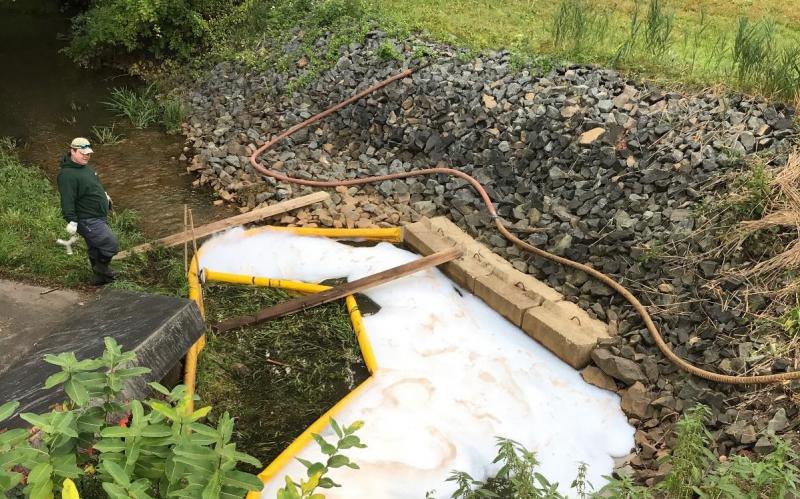 - PFAS-filled Aqueous Film Forming Foam in the brook behind Paddy Abramowicz’s home in Windsor. (Credit Paddy Abramowicz)