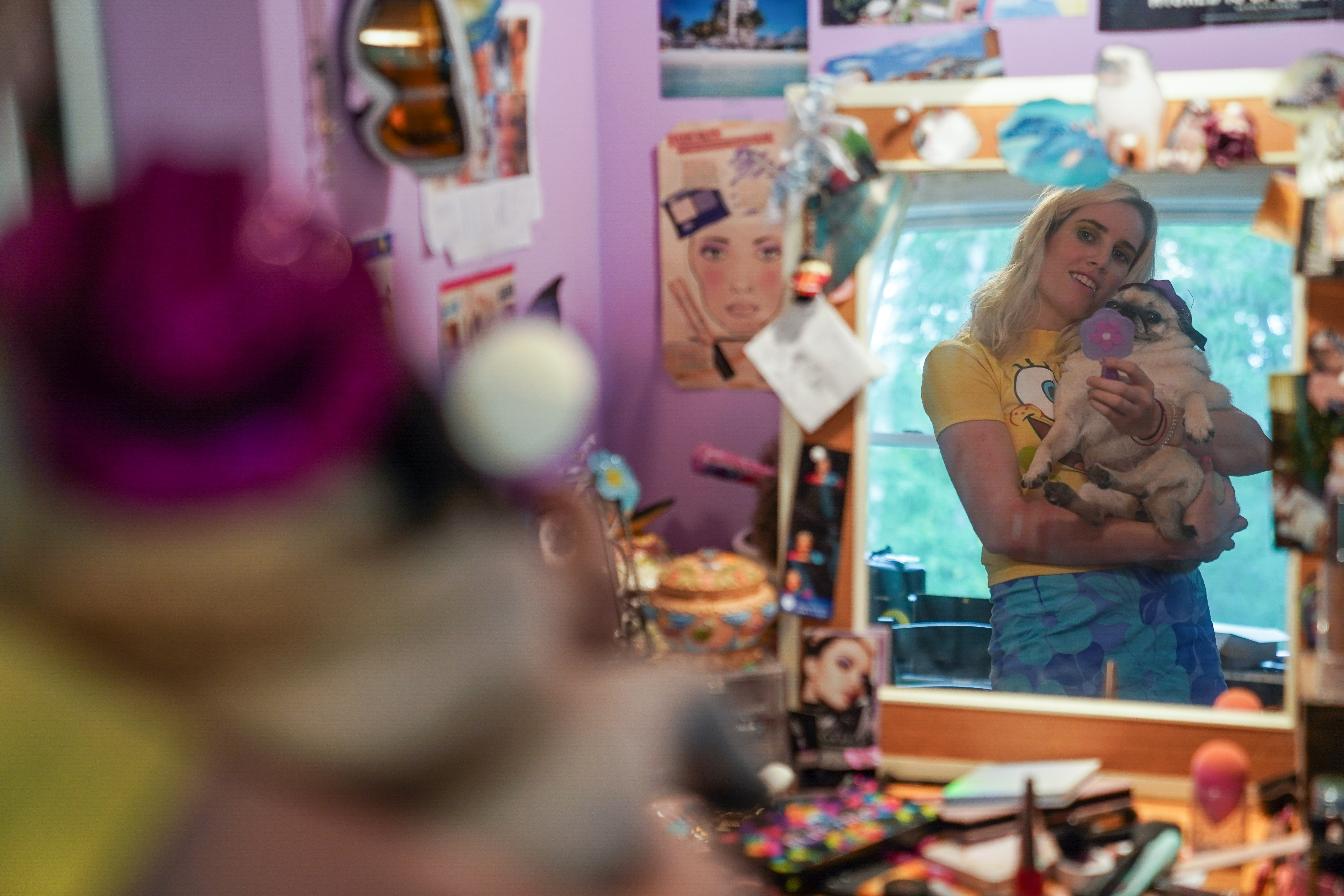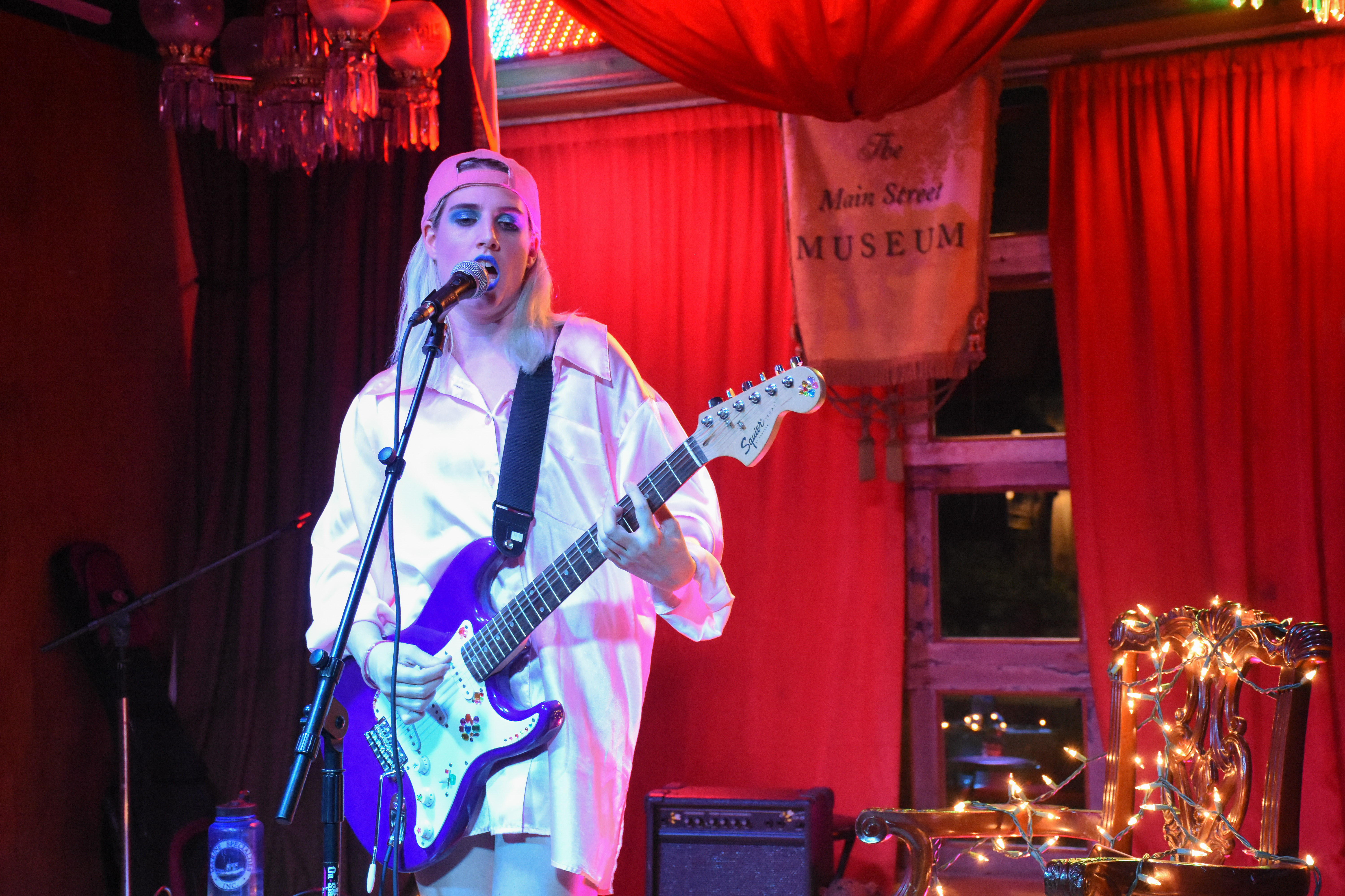 It’s late July in a tiny venue, in a small town, in Vermont. This is an odd space. The walls are lined with strange artifacts and curiosities, including a canning jar that holds Elvis’ gallstones. Or so the label says. It’s the type of place where outcasts and misfits feel right at home. Tonight’s performer is no exception. It’s Kelsie Hogue, a.k.a. Sir Babygirl. She’s wearing a backwards bubblegum pink ball cap and shiny silk robe. She cradles the mic close to her mouth. Her lips are painted cornflower blue—the same as her eye shadow.