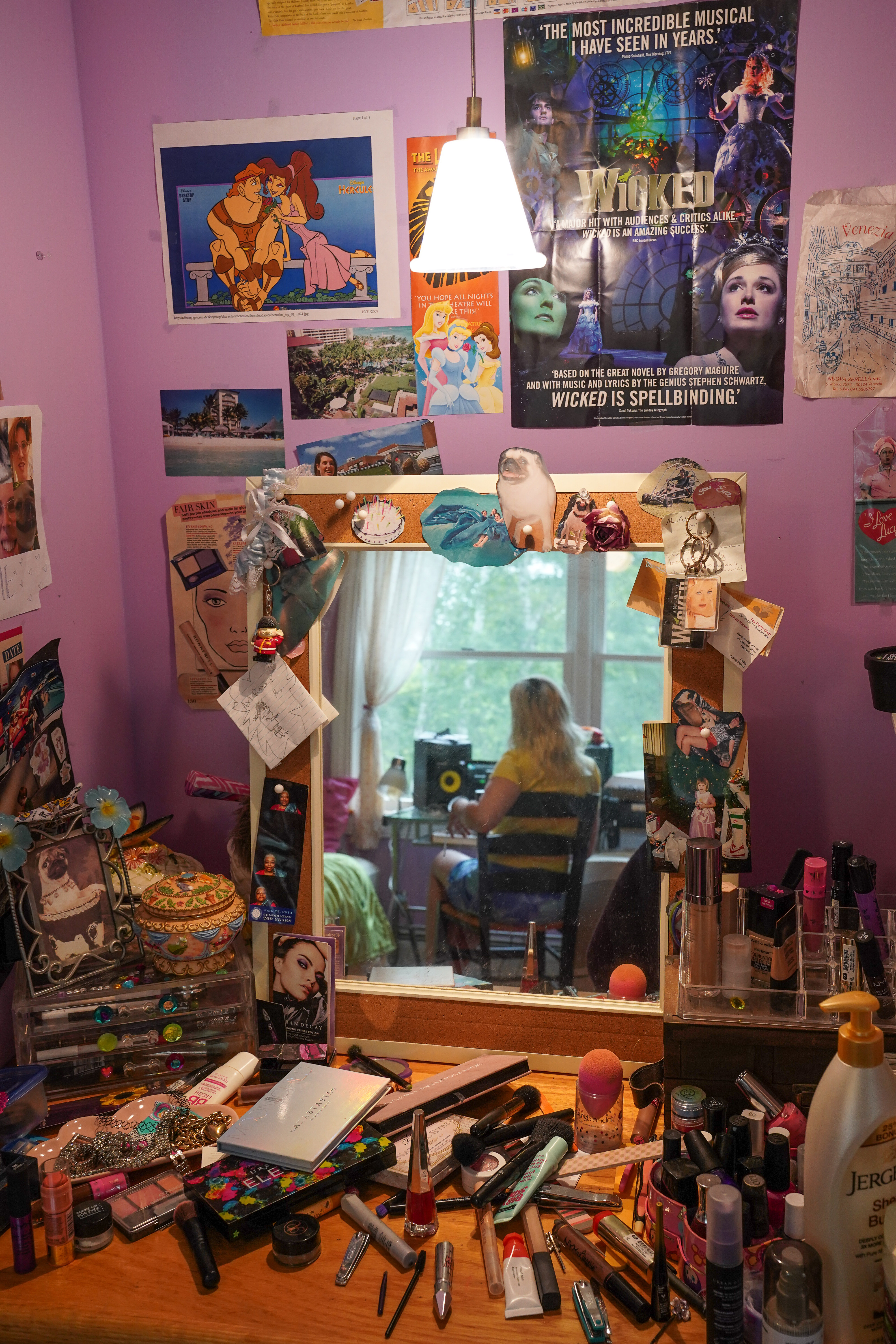 “This is my childhood bedroom, and I guess it still is, ’cause I’m still a child and it’s still a bedroom,” Hogue explains as she shows off the space, which is half bedroom, half music studio. The lavender walls are covered in ticket stubs, musical theater flyers, photos of female pop idols, awkward middle school portraits. There are instruments, everywhere: “We’ve got an acoustic guitar. We have an electric guitar, which I’ve bedazzled. My first instrument was alto saxophone, because of Lisa Simpson. And then bass, because I wanted to play ‘Maxwell’s Silver Hammer.'”