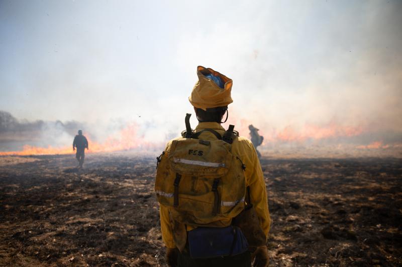 Before fifteen acres are set to flame, workers scorch ground, creating a blackened “safe zone” to contain the fire.