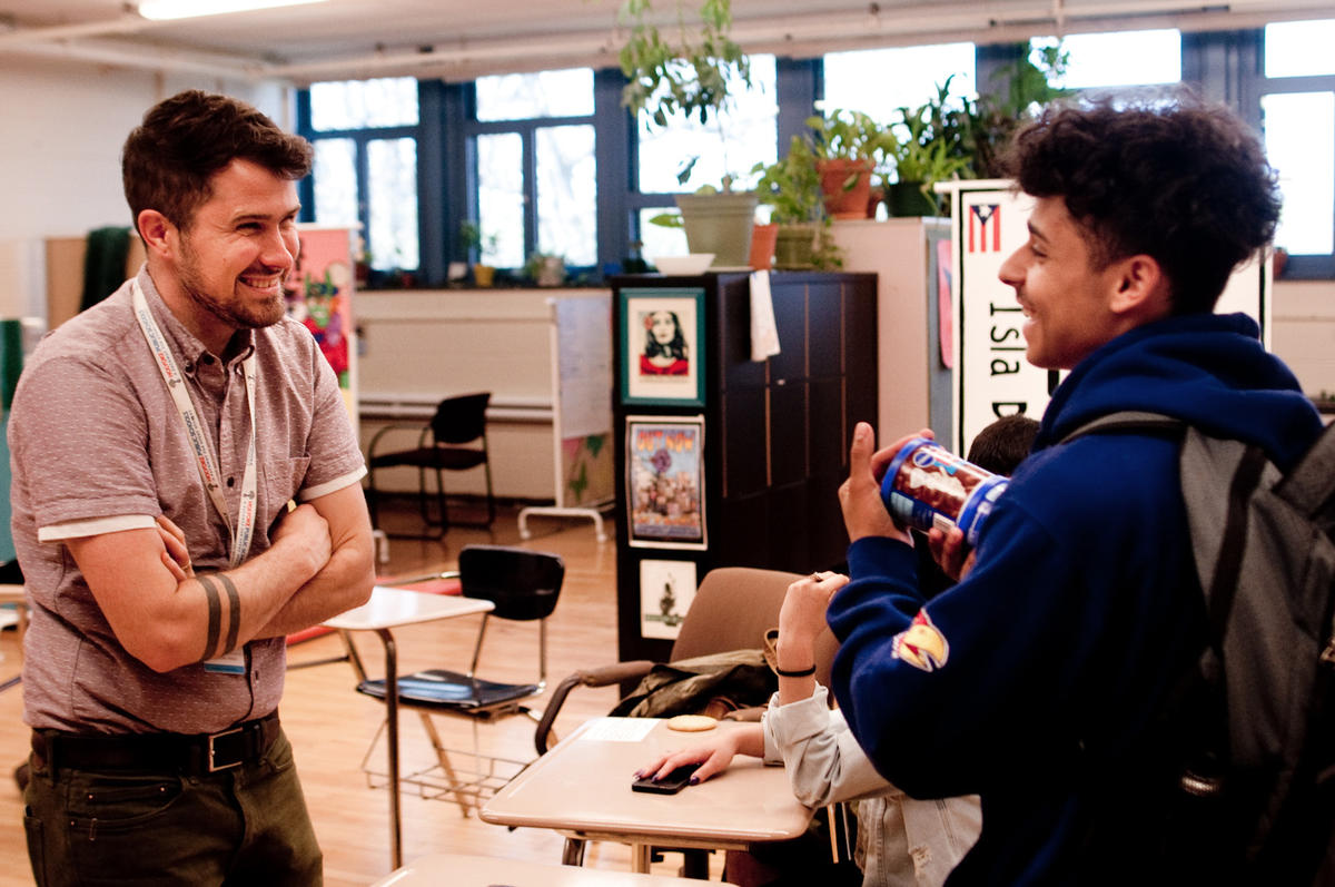 Pa’lante director Luke Woodward speaks with peer leader David Serrano, a sophomore, in the student support room. Photo by Ben James for NEPR