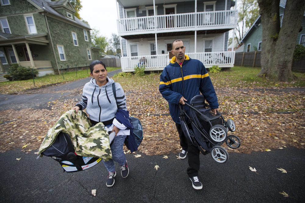 Alicea y Santini caminan en las afueras de su departamento en Greenfield de camino a Enlace de Familias. (Jesse Costa/WBUR)