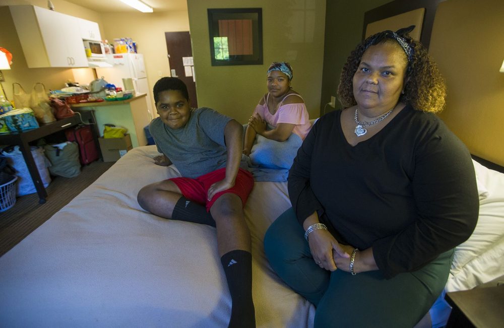 Lisbeth Sandoval, (far right), her daughter, Sheylibeth, and her son, Stephen, inside a hotel room in Lowell. Photo by Jesse Costa for WBUR