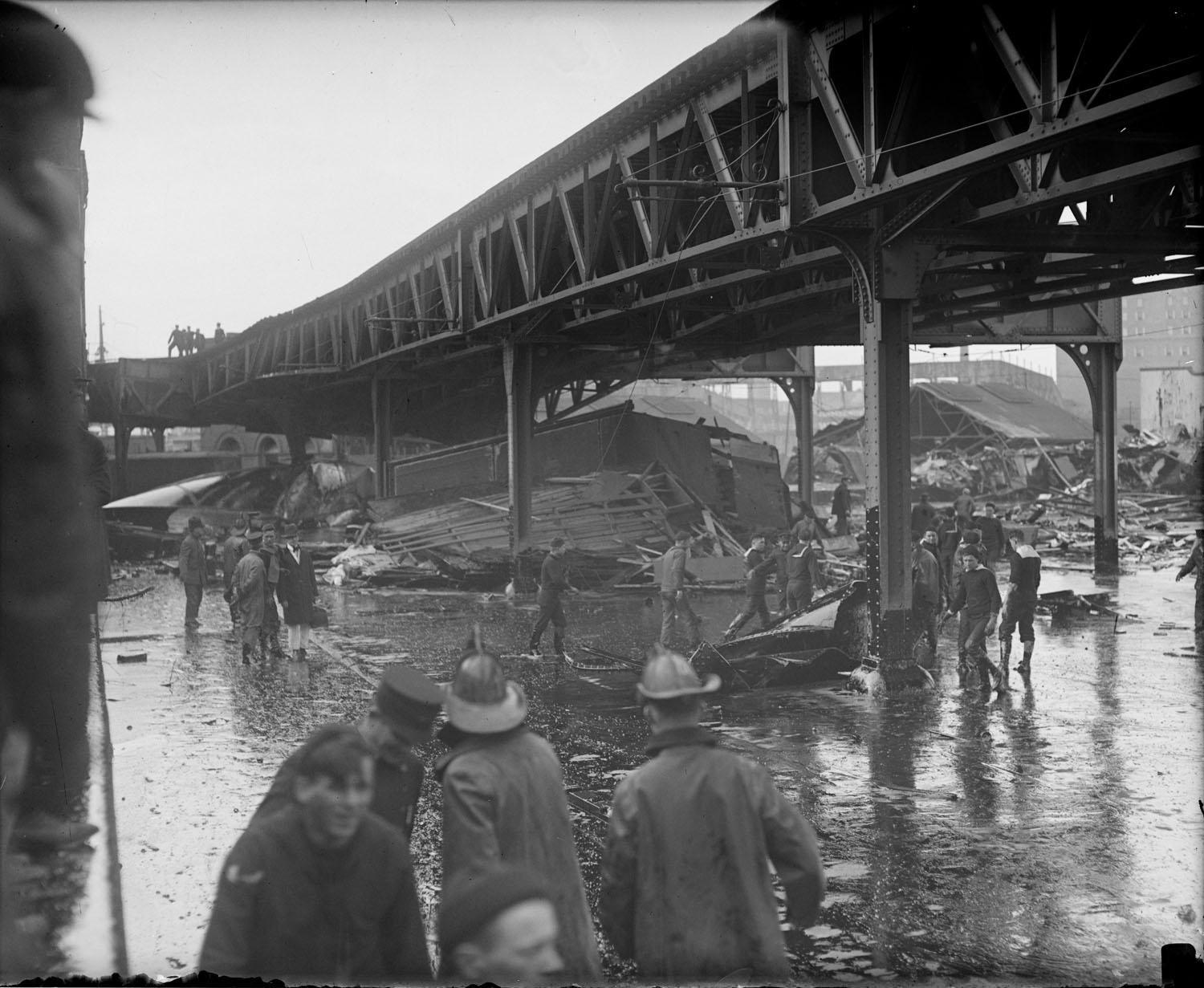Wreckage under the elevated where many express trucks parked, Molasses Disaster. Photo courtesy of the Boston Public Library, Leslie Jones Collection