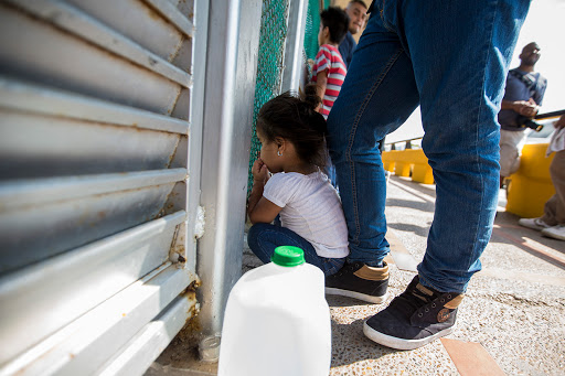A three-year-old from Honduras peers through a fence at the U.S. – Mexico border while her family waits to apply for asylum. Photo by Jesse Costa for WBUR