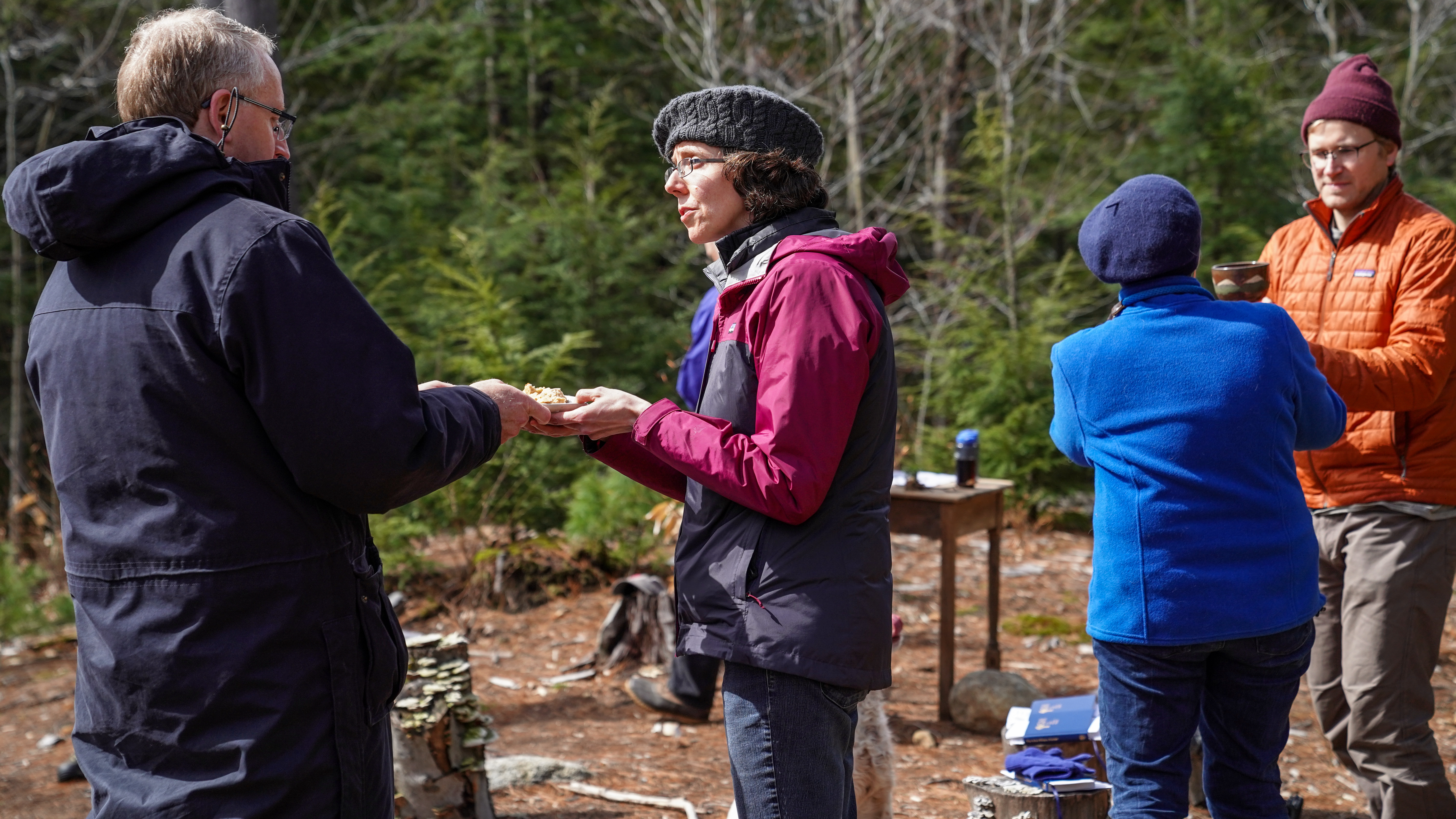They gather to pray around the altar. It’s a small wooden table set on a sunny knoll beneath three white pine trees. On top of the table sits communion bread wrapped in foil, wine in a Nalgene bottle, and offerings of clover, mushrooms, and berries gathered from the surrounding forest. This is Church of the Woods.