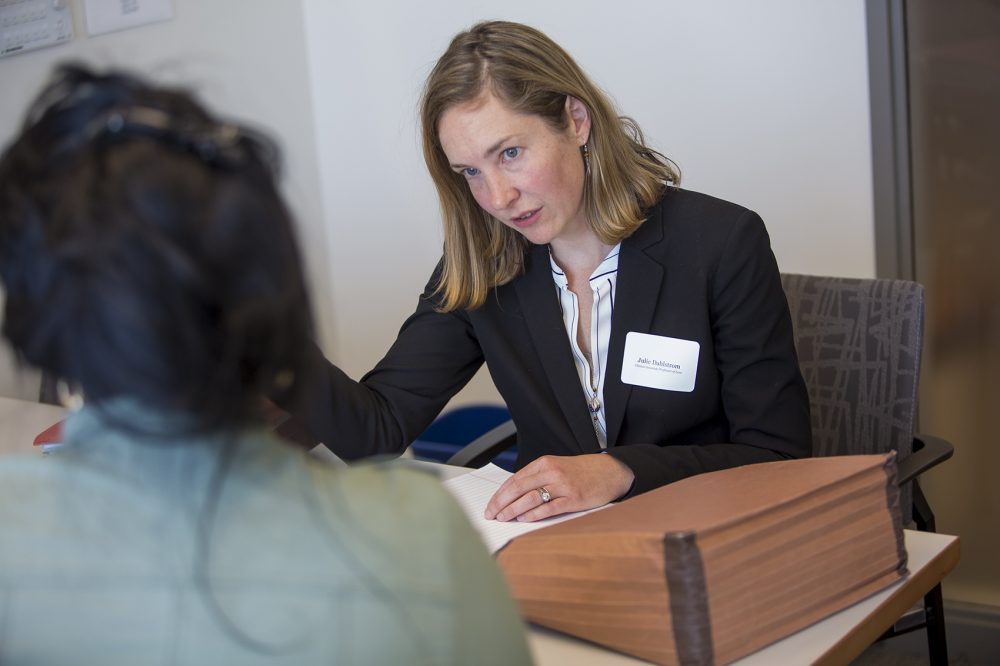 Julie Dahlstrom, directora del Programa de los Derechos de los Inmigrantes y Tráfico Humano de la Universidad de Boston, se reúne con un cliente que está esperando respuesta respecto a una Visa U que solicitó hace dos años. (Jesse Costa/WBUR)